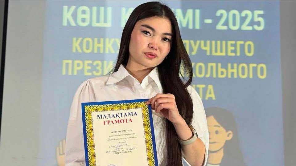 Бүгін аудандық «Көшкөсемі – 2025» байқауында біздің мектебіміздің парламент президентінің міндетін атқарушысы — Сагындыкова Гулим ІІІ орын иегері атанды!