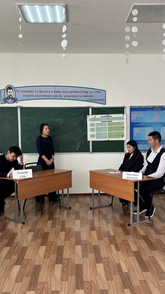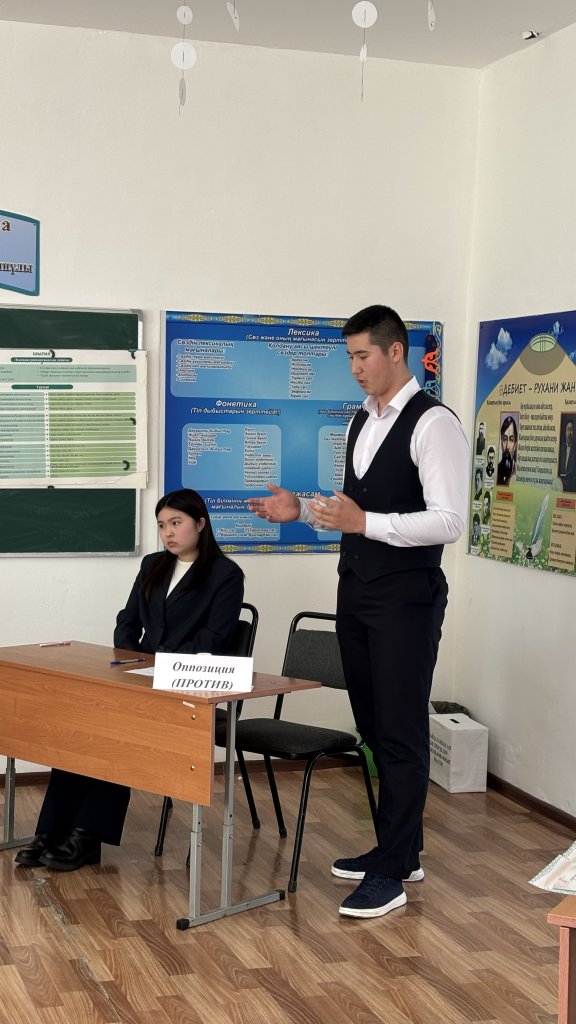 Дебат барысында оқушылар екі топқа бөлініп, өз аргументтерін дәлелдеп, қарсыластың пікірін талдап, ой-пікір алмасу қабілеттерін көрсетті.