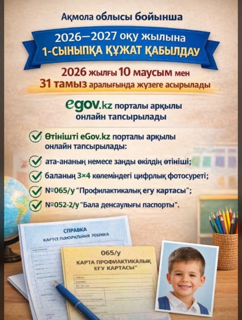2026–2027 оқу жылына 1-сыныпқа құжат қабылдау Ақмола облысы бойынша 2026 жылғы 10 маусым мен 31 тамыз аралығында жүзеге асырылады. Өтінішті eGov.kz порталы арқылы онлайн тапсырылады.